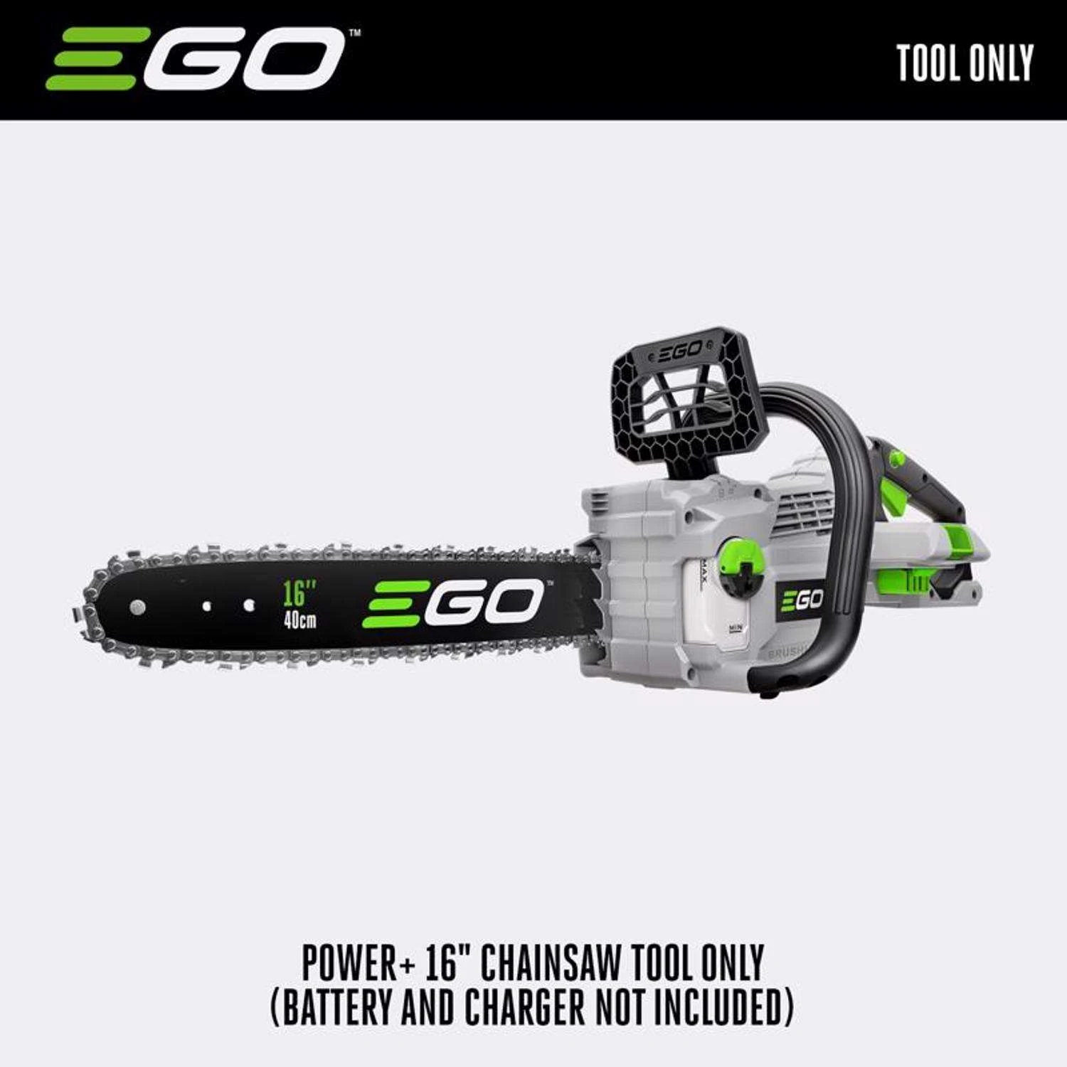 The EGO POWER+ 16-in. Chain Saw features an advanced, high-efficiency brushless motor that delivers power equivalent to a 40CC gas chainsaw without the noise, fuss, or fumes. Powered by any EGO POWER+ 56V ARC Lithium battery, this cordless chainsaw delivers up to 130 cuts on a 4×4 when used with the recommended 2.5Ah ARC Lithium battery (available separately). The chainsaw features a tool-free chain tensioning system that allows fast, easy bar and chain adjustments through independent dials. These low-profile dials also allow the electric chainsaw to cut flush to the ground. Its 16-inch bar and chain with 20m/s chain speed delivers clean, efficient cuts while its automatic oiling system keeps the saw lubricated throughout the cutting process. For added control and safety, the saw is equipped with robust metal bucking spikes and kickback brake with an easy-to-see brake position indicator. Experience Power Beyond Belief without the noise, fuss, or fumes. 3/8-inch pitch, .043-inch gauge chain, 52 drive links * 40CC gas equivalent Up to 130 cuts on a 4×4 with the recommended 56V 2.5Ah ARC Lithium battery (available separately) * 16-inch bar and chain 20m/s chain speed IPX4-rated weather-resistant construction * Tool-free chain tensioning system for quick, easy bar and chain adjustments * Low kickback chain design with brake indicator * Automatic oiling Spill-free oil reservoir